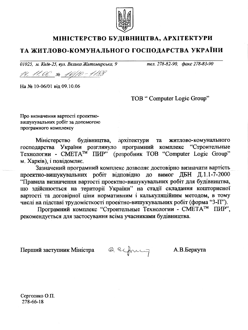 Письмо Министерство строительства, архитектуры и жилищно-комунального хозяйства Украины от 14.11.2006 № 10/10-1188 «О рассмотрении программного комплекса «ПК Строительные Технологии - СМЕТА™ ПИР».